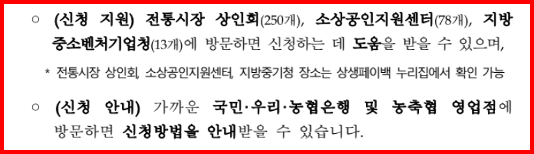 - 신청지원처: 전통시장상인회, 소상공인지원센터, 지방중기청