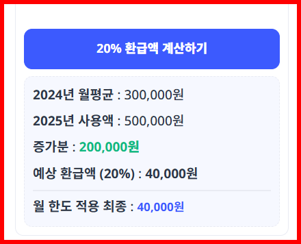 환급액 = (2025년 사용액 − 2024년 월평균 사용액) × 20%